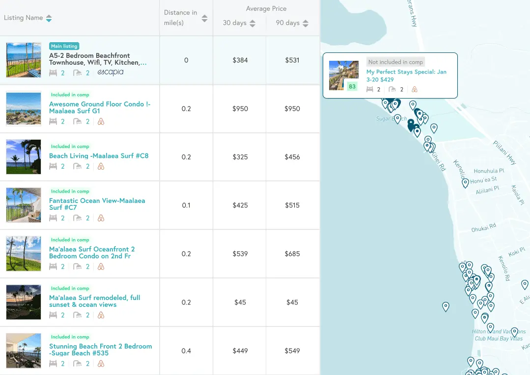 Crea y guarda conjuntos competitivos personalizados con anuncios de Airbnb y Vrbo para tus propiedades en el mapa.