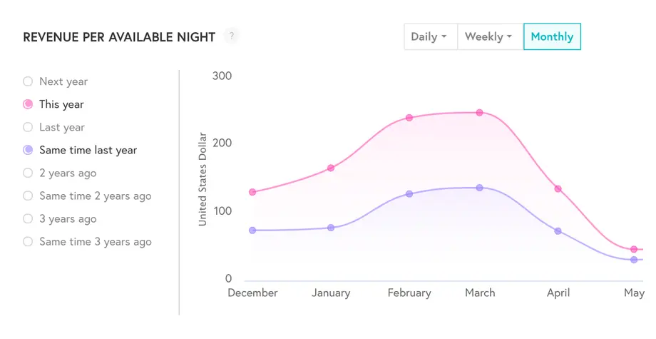 ¡Estamos aquí para ayudar! Para empezar, nuestro equipo de expertos ha seleccionado cuidadosamente los gráficos más importantes para impulsar la toma de decisiones para su empresa, basándose en años de experiencia ayudando a clientes como usted a optimizar los precios. Te recomendamos que comiences con los gráficos de ingresos, ocupación y ADR para obtener una visión general de tu desempeño y empezar a destacar las oportunidades de mejora. ¿Sigue el ritmo de sus ingresos en función del nivel en el que se encontraba el año pasado por esta época? De no ser así, ¿se puede atribuir a una ocupación más baja o a una ADR más baja? ¿Dónde están las brechas?