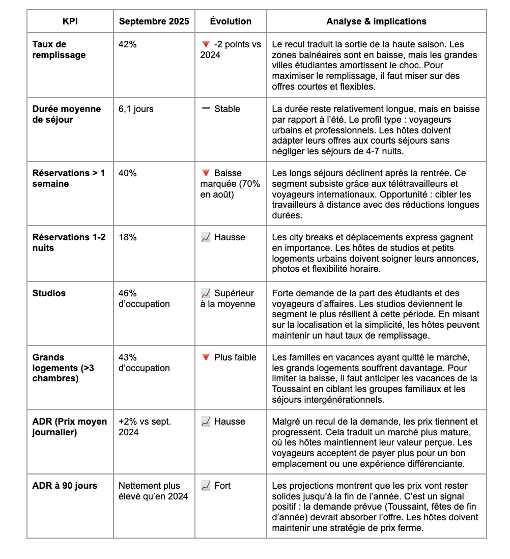 - Grands logements (>3 chambres) : Leur taux d’occupation tombe à 43%, car la clientèle familiale disparaît avec la rentrée. Toutefois, ce type de logement garde un potentiel sur les périodes scolaires (Toussaint, Noël) ou pour accueillir des groupes de voyageurs.