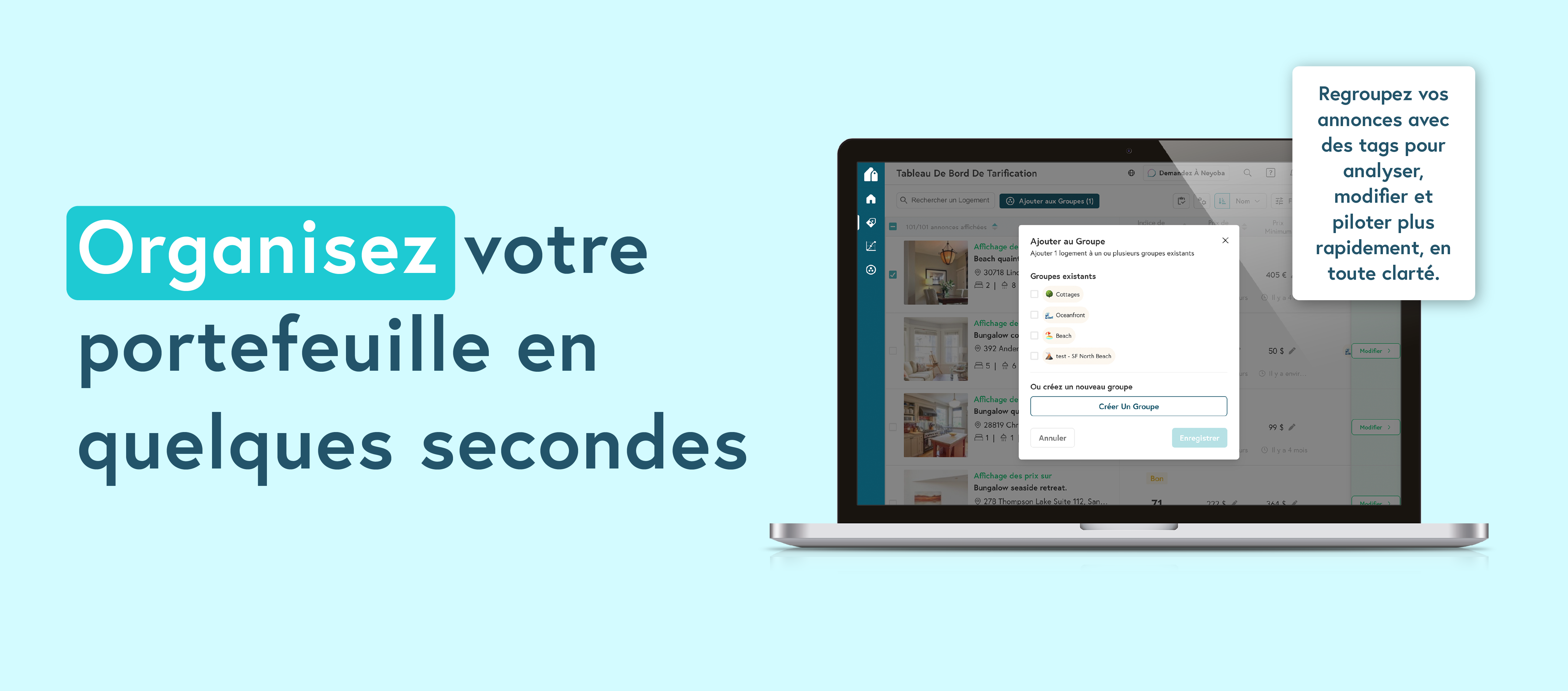 Les Groupes de logements transforment le filtrage en un véritable outil stratégique. Vous pouvez créer vos propres étiquettes selon ce qui compte pour votre activité : régions, propriétaires, segments de performance ou flux opérationnels. Chaque groupe peut être utilisé pour la tarification, les rapports et l’analyse, afin de comparer les résultats et d’appliquer des ajustements en quelques secondes, sans exporter de données ni recréer de filtres.