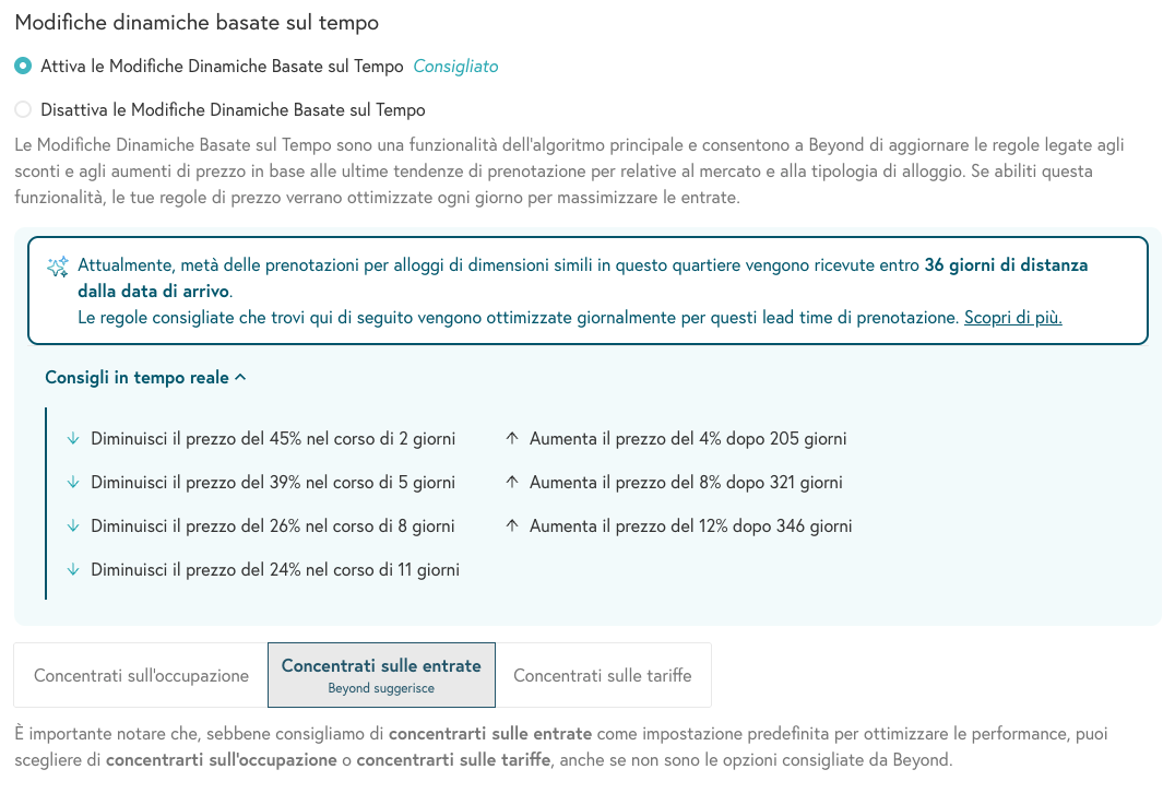 Gli sconti tradizionali sono strumenti poco precisi perché abbassano i prezzi indipendentemente da ciò che sta accadendo sul mercato. Le Modifiche Basate sul Tempo funzionano in modo diverso: adattano i prezzi in tempo reale in base all'andamento delle prenotazioni, alla finestra di prenotazione media e alla domanda nella tua zona.