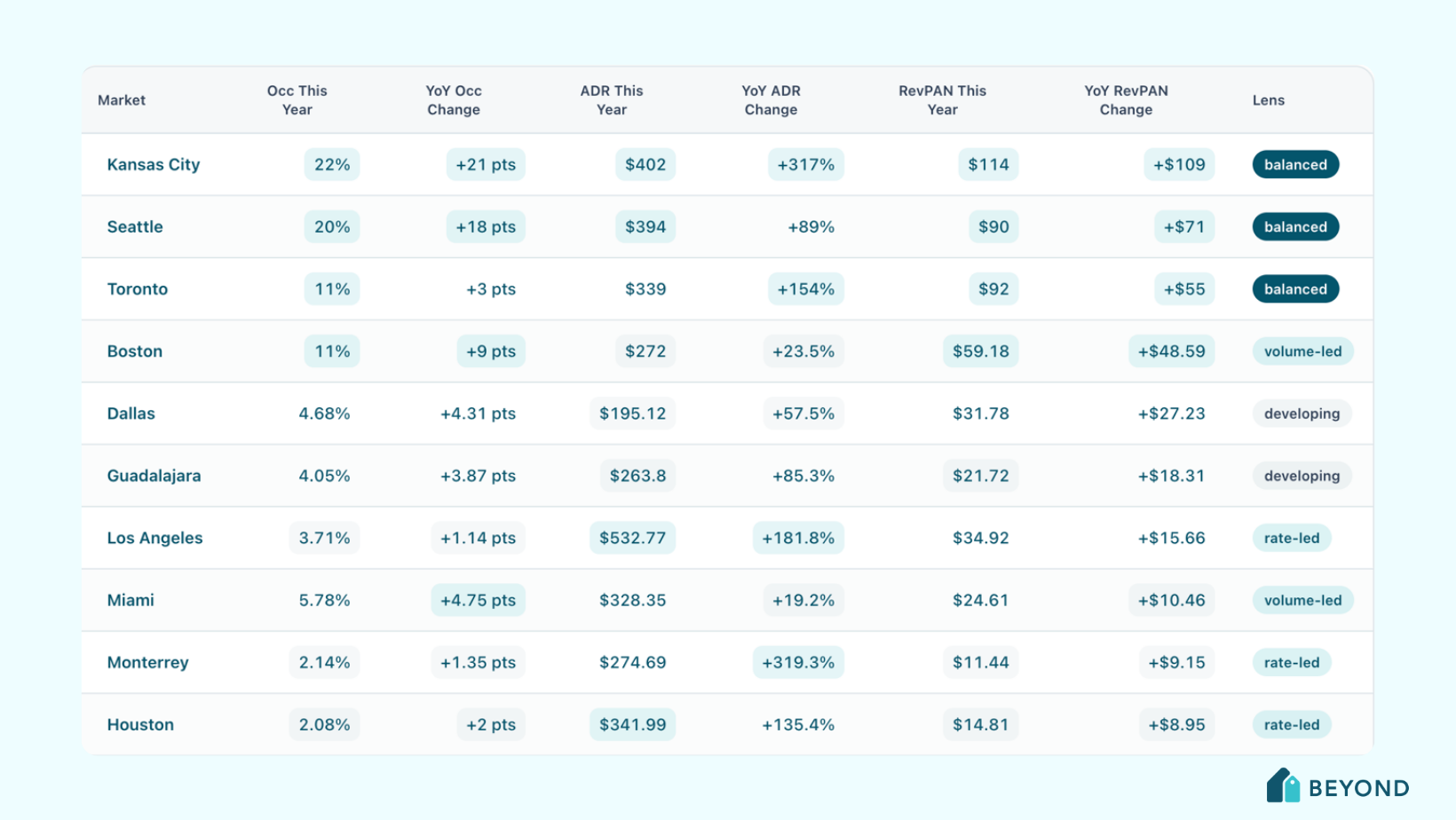 seeing clear movement in both occupancy and rates, but not in a uniform way. Some cities are showing stronger on-the-books occupancy, others are seeing rates move ahead of volume, and in several cases the two are already diverging.