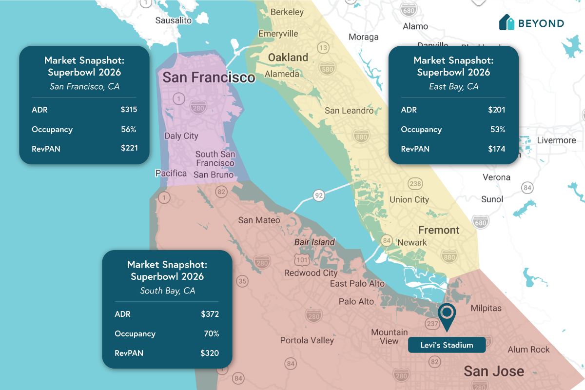 Early data shows that many travelers are prioritizing proximity to the stadium and paying a premium to do so. This is a strong revenue signal for short-term rental operators in the South Bay. Nearby areas such as the East Bay and San Francisco are also benefiting from spillover demand, particularly for larger groups and guests extending their stays beyond game day.